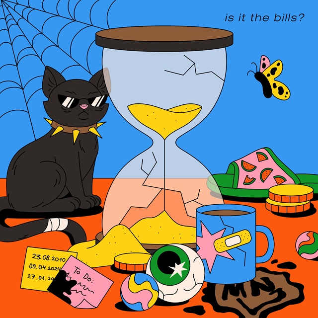 The EP continues to delight, right away with the memorable “Don’t Forget Your Pills,” where accounts of burnout, medication reliance, and incessant advice frame further accounts of modern life. Balmy guitar twangs propel with hypnotic allure alongside the head-nodding vocal cadence. Elsewhere, “Family Matters” succeeds with an eerie title-touting proclamation, lingering with robotic synth-pop charm, while EP finale “More Means Less” stirs in its alternations between funky Momus-esque art-pop and effervescent dreaminess. is it the bills? is an inventive, melodic standout of an EP from Middle Name John.